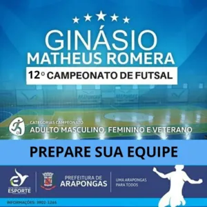 A Prefeitura de Arapongas, através da Secretaria Municipal de Esporte informa que estão abertas as inscrições para o 12º Campeonato Mateus Romera de Futsal, nas categorias: adulto masculino, adulto feminino e master masculino.