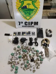 No fundo do pátio, os agentes da carceragem localizaram 2 aparelhos celulares, 7 carregadores de celular e 106 porções de maconha, pesando 154 gramas. Ele recebeu voz de prisão e foi encaminhado para a delegacia.