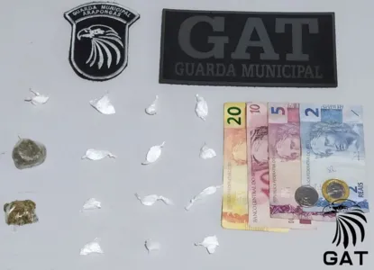 A equipe GAT realizava patrulhamento pela Rua Jandaia Verdadeira equina com a Rua Alma de Gato, quando flagrou um jovem já conhecido no meio policial. Durante abordagem a GM encontrou no bolso dele, duas porções de maconha e 15 buchas de cocaína além de R$38,50, dinheiro que seria do tráfico.