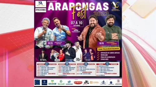 A Prefeitura de Arapongas está em contagem regressiva para as celebrações que irão marcar os 76 anos de emancipação. A programação especial começa dia 07 com a abertura da “Arapongas Fest 2023” que segue até o dia 10, no Centro de Eventos Expoara. Com uma grade completa de shows gratuitos, a Arapongas Fest 2023 contará com a participação de artistas conhecidos nacionalmente, como a dupla Mato Grosso e Mathias e César Menotti e Fabiano, mas também abrindo espaço para os cantores regionais e locais, além de outras atrações, como espaço kids, praça de alimentação, exposição de carros antigos e motos e muito mais.
