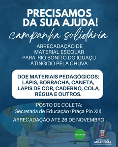 A Prefeitura de Arapongas, por meio da Secretaria de Educação, está arrecadando materiais escolares para apoiar a população de Rio Bonito do Iguaçu, cidade do Centro-Sul do Paraná, atingida por um tornado na semana passada.