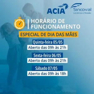 Definido pelo Sindicato do Comércio Varejista de Londrina e Região (Sincoval) e Sindicato dos Empregados no Comércio de Londrina e Região (Sindecolon), o horário especial pretende facilitar as compras dos presentes para o Dia das Mães, comemorado no domingo, 08 de maio. No sábado (07), as lojas funcionam das 09h às 18h.