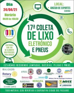 Será realizada em Arapongas, no próximo dia 24 (sábado), a 17ª Coleta de Lixo Eletrônico e Pneus. Uma realização da Secretaria do Meio Ambiente – por meio da Cooperativa de Recicladores Cidade dos Pássaros e Rotary Club Amanhecer Arapongas. A ação está marcada das 8h30 às 16h30 – no pátio do Ginásio de Esporte Luiz A. Zin ( Rua Marabu, 810 – Centro).