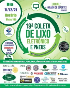 A Prefeitura de Arapongas divulgou nesta quinta (25), que a 19ª edição da coleta de lixo eletrônico e pneus acontecerá no próximo dia 11 de dezembro. O evento é realizado pela Cooperativa de Recicladores Cidade dos Pássaros e Rotary Club Amanhecer Arapongas, com o apoio da Prefeitura.