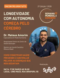Arapongas terá uma palestra no dia 17 de março sobre como construir saúde, prevenir e controlar melhor as doenças. Ministrada pelo doutor Mateus Amorim, especialista em longevidade e prevenção de doenças, o evento será às 19h, no Cine Mauá, durante a 2ª edição local da Semana Mundial do Cérebro.