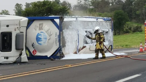Uma carreta carregada com líquido corrosivo e inflamável tombou no início da tarde desta quarta-feira (1º) na PR-444, nas proximidades do Rio Pirapó, em Arapongas. Segundo informações da Defesa Civil, o veículo transportava uma carga de ácido propiônico e o trecho entre Arapongas e Mandaguari foi interditado, sem previsão de liberação.