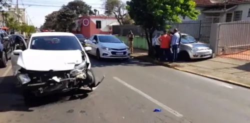 Na manhã desta terça-feira (10), um acidente entre dois carros foi registrado na Rua Uirapuru, com a Rua Harpia, área central de Arapongas. Um dos veículos foi parar em cima da calçada devido à força da batida.