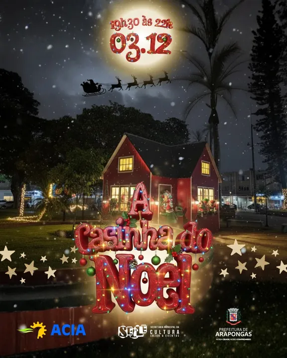 A Prefeitura de Arapongas, por meio da Secretaria Municipal de Cultura, Lazer e Eventos (SECLE), convida a toda a população para a abertura da Casinha do Noel, que vai ocorrer nesta quarta-feira (03), a partir das 19h30, na Praça Doutor Júlio Junqueira (Praça Mauá).