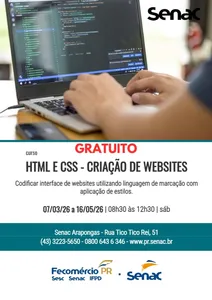 O Senac Arapongas está com inscrições abertas para o curso gratuito de "HTML e CSS – Criação de Websites", destinado a quem deseja iniciar a trajetória na programação e aprender a desenvolver as próprias interfaces digitais. A formação presencial possui carga horária de 36 horas e as aulas serão ministradas entre os dias 7 de março e 16 de maio, sempre aos sábados, das 8h30 às 12h30. O objetivo central da capacitação é ensinar o aluno a codificar sites utilizando linguagens de marcação e aplicação de estilos.