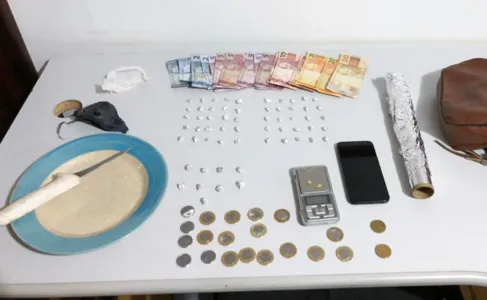 A mulher foi abordada na casa com mais três pessoas. Durante as buscas foram encontradas 59 pedras de crack prontas para a venda, uma balança de precisão e uma faca. Na bolsa da mulher foram encontradas mais duas pedras da mesma droga.