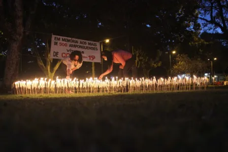 Membros do Coletivo Arapongas Pela Vida e Democracia colocaram 500 velas acesas na Praça do Cemitério.