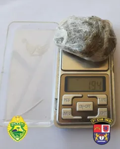 Durante revista pessoal, nada de ilícito foi encontrado. No entanto, no pátio da referida empresa, foi localizada uma porção de maconha, embrulhada em papel filme, pesando 19,4 gramas.