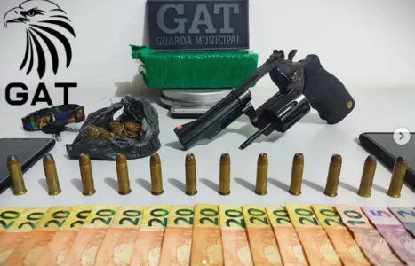 Conforme o boletim, a GM encontrou na casa do homem uma balança de precisão, 30 gramas de maconha, um celular, R$ 371 em notas, R$ 62,40 em moedas diversas, um revólver cal. 38, 8 munições CBC SPL +P+ e 04 munições G.F.L. 38 Special. A GM deu voz de prisão ao homem, que foi levado para a 22ª SDP.