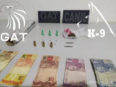 E em busca na sua casa foi solicitado apoio a equipe CANIL/GM a qual durante as buscas com auxílio do cão Zeus, foi localizado R$287,00 reais em dinheiro trocado, 10 invólucros em papel alumínio contendo a substância análoga a crack dentro de uma caixa em cima da cômoda de seu quarto, que posteriormente pesado, deu o peso de 02 gramas, mais 3 munições intactas de arma de fogo no calibre 9x19 (9mm) de marca "FLB" na mesma cômoda, bem como uma lâmina de barbear utilizada para fracionamento da droga juntamente com papel alumínio e alguns resquícios de maconha em farelos com o peso de 03 gramas aproximadamente.