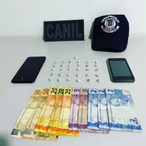 Solicitado apoio da equipe Canil, o cão de faro Zeus encontrou um invólucro de plástico contendo 26 pedras de crack e R$16 em dinheiro. Na residência também foram localizados 1 celular marca Samsung e 1 celular Multilaser.