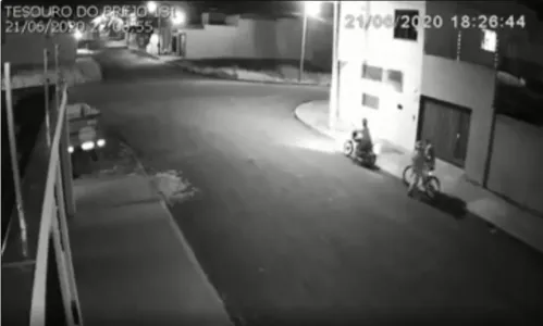 A câmera de segurança flagra dois indivíduos, que estavam em uma moto. O ocupante da garupa desce e dá voz de assalto ao cidadão, que entrega a bike.