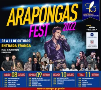 Faltando quatro dias para o início das comemorações, a Secretaria Municipal de Cultura, Lazer e Eventos (Secle) já tem o cronograma completo dos shows e demais atrativos que celebram o 75º. aniversário de Arapongas. A Arapongas Fest 2022 acontece de 08 a 11 de outubro, no Centro de Eventos Expoara. O ambiente contará também com Praça de Alimentação e Espaço Kids.