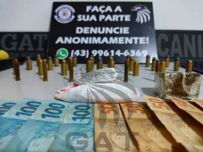 Em cima do armário, conforme a GM, também foi encontrada outra porção de maconha de 1,2 gramas e em seu quarto, foi lozalizado outro invólucro da mesma droga, pesando 2,5 gramas. Ainda durante as buscas, a GM achou um carregador prolongado de pistola .40, contendo 23 munições intactas e também no guarda-roupas, foram localizadas mais 8 munições de calibre .22. Na carteira do abordado, haviam R$1230, cujo ele não sabia dizer sobre a procedência.