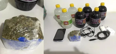 A GM fez buscas no quintal e localizou uma sacola plástica contendo uma porção de maconha, pesando em torno de 107 gramas, 02 carregadores de celular, 01 fone de ouvido e uma chave pequena.