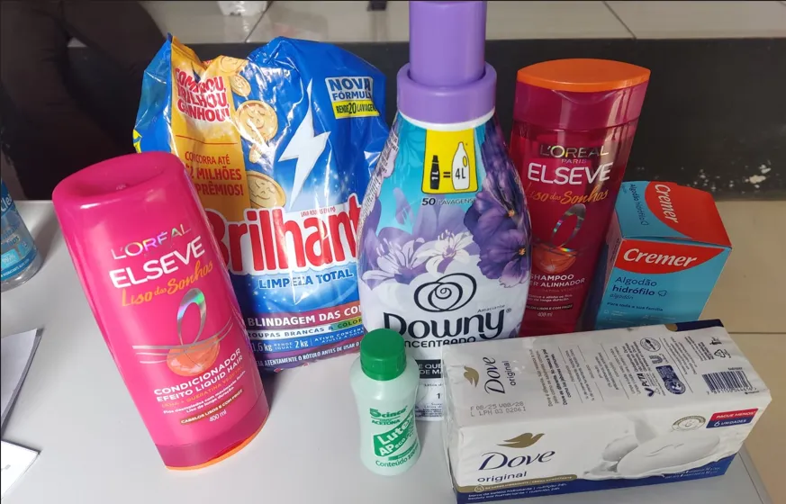Ela foi abordada já do lado de fora do estabelecimento. Com ela, os policiais encontraram um frasco de amaciante, um pacote de sabão em pó, xampu e condicionador, uma caixa de algodão, um frasco de acetona e um pack com seis sabonetes.