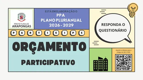 A Prefeitura de Arapongas contabiliza 343 respostas no questionário do Orçamento Participativo até esta segunda-feira, 07. Todos os cidadãos e cidadãs do município são convidados a colaborar acessando o Questionário Digital (disponível através do link https://docs.google.com/forms/d/e/1FAIpQLSdj4GyrwlmtKiaYDlsRvX-1L4FSuH9-ta-AXxq7RzP3XttNjg/viewform ou QR Code) até o dia 27 de julho.