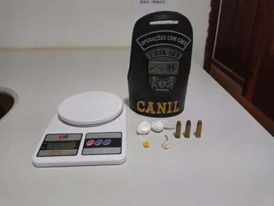 A PM informou que durante buscas na residência do suspeito, os policiais encontraram dentro de uma xícara três munições de calibre 38, duas porções de cocaína, duas pedras de crack e uma balança de precisão.
