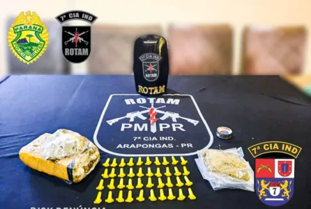 Em busca domiciliar em ambas as casas, anexas no mesmo quintal, foi localizado sobre uma caixa d'água, 01 invólucro plástico contendo 01 tablete "in natura", pesando 446,4 gramas e 01 porção dichavada 63,2 gramas de maconha. Os envolvidos foram encaminhados à 22ª Subdivisão Policial de Arapongas.