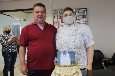 Nesta quinta-feira (07), o prefeito Sérgio Onofre recebeu a visita da chef pâtissier, Giovana Daroda, que fez um bolo especial para a data comemorativa: os 74 anos de Arapongas.