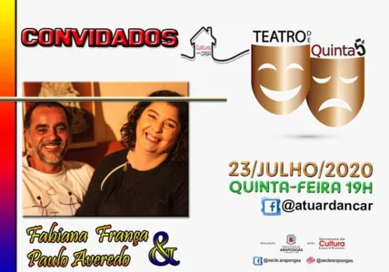 Nesta quinta-feira (23) o Cultura em Casa, através do ATUAR – Curso Livre de Teatro, apresentará mais um episódio do “Teatro de Quinta”, tendo como convidados os artistas Fabiana França e Paulo Averedo.