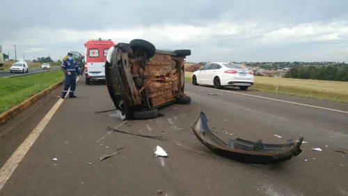 Um acidente entre dois veículos com placas de Apucarana, um Fiat Uno e um GM Celta, foi registrado na tarde desta sexta-feira (10) na BR 369, na entrada da cidade de Arapongas. Um dos veículos chegou a capotar na pista.