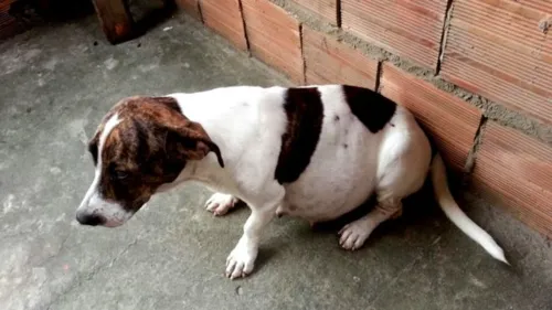 Prenha há dois meses, a cadela foi atingida por dois tiros feitos por um sargento da Polícia Militar, afirma sua dona. Mesmo ferida, chegou a subir as escadas da casa onde mora em busca de abrigo, mas desabou a um passo da entrada.