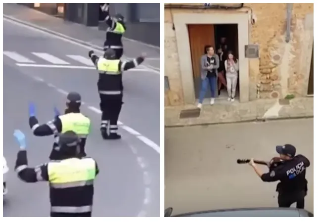 Nesta semana, o The Guardian também publicou um vídeo semelhante, onde a polícia espanhola toca e canta para famílias durante isolamento social. Policiais de Mallorca animaram as pessoas, que acompanhavam com palmas das portas e janelas de suas casa.