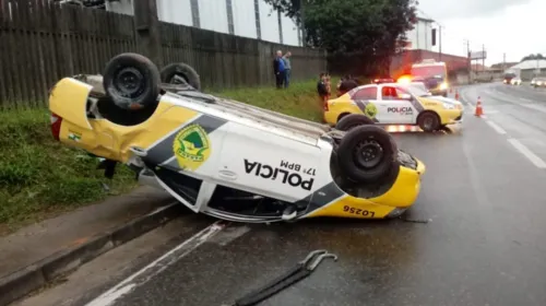 Uma viatura da Polícia Militar (PM) capotou na tarde deste sábado (2), na BR-376, em São José dos Pinhais, região metropolitana de Curitiba, e dois soldados ficaram feridos. Os dois militares do 17º BPM sofreram ferimentos graves e um deles foi levado ao Hospital Cajuru de helicóptero.