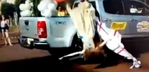 A modelo conduzia a bandeira do município em cima de uma caminhonete, quando teve um mal súbito e caiu. Ela foi socorrida e levada ao hospital.