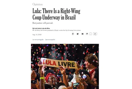 Com todas as pesquisas mostrando que eu venceria facilmente as eleições de outubro, a extrema direita brasileira está tentando me tirar da disputa. Minha condenação e prisão são baseadas somente no testemunho de alguém cuja própria sentença foi reduzida em troca do que ele disse contra mim. Em outras palavras, era do seu interesse pessoal dizer às autoridades o que elas queriam ouvir.