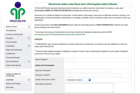 O Procon do Paraná disponibiliza em seu site um mecanismo para denúncias de consumidores que estão recebendo notas fiscais sem as informações sobre os tributos que incidem na compra de produtos e serviços. O órgão é vinculado à Secretaria de Estado da Justiça, Família e Trabalho.