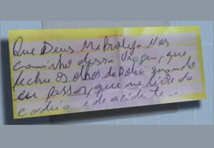 Na mensagem, escrita a punho, ele dizia: “Que Deus me proteja nos caminho (sic) dessa viagem. Que feche os olhos da polícia quando eu passar, que me livre da cadeia e de acidente".