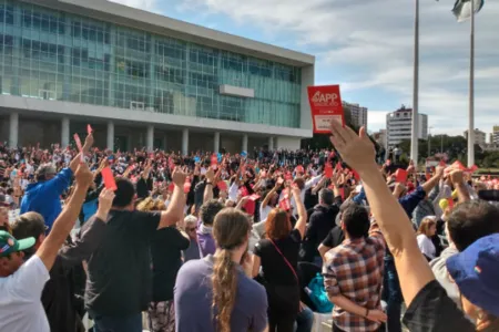 Mais de 2 mil professores(as) e funcionários(as) de escola da rede pública se reuniram em assembleia estadual da APP-Sindicato na manhã deste sábado (13), em frente ao Palácio Iguaçu, em Curitiba.Os trabalhadores debateram a proposta de reposição salarial apresentada pelo governo, nesta sexta-feira (12), e aprovaram a suspensão da greve.
