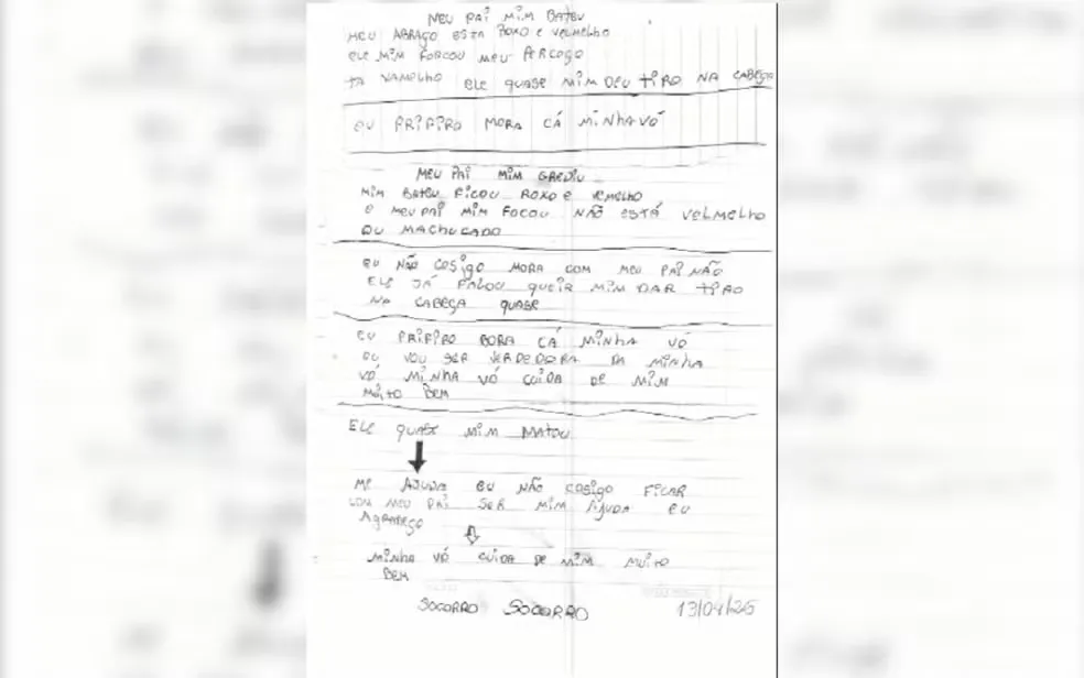 No texto, a jovem descreve, em frases curtas, episódios de violência física. Ela relata ter sido agredida e estrangulada, afirmando ainda que o pai “quase atirou” contra ela.