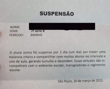 Nesta quarta-feira (16), um aluno do terceiro ano do Ensino Médio foi suspenso das aulas, após levar uma melancia inteira para a escola e compartilhar com os amigos. O acontecimento ocorreu no Colégio Fereguetti, uma instituição particular da Zona Leste de São Paulo.