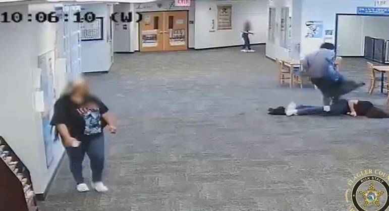 As câmeras de segurança da Matanzas High School, no condado de Flagler (leste da Flórida), registraram o espancamento, que aconteceu em um corredor do colégio, até que os seguranças chegaram e renderam o agressor -- assista abaixo ao vídeo com o momento da prisão.