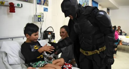 Bruno Díaz se fantasia como o vigilante de Gotham para alegrar crianças que estão internadas em hospitais.