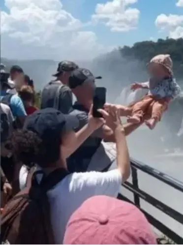 Um turista foi flagrado colocando a vida de um bebê em risco ao segurá-lo do lado de fora da grade de proteção da Garganta do Diabo, nas Cataratas do Iguaçu, para tirar uma foto. O caso ocorreu na tarde da última terça-feira (17), no lado argentino do parque, e as imagens viralizaram nas redes sociais. O local possui uma queda de aproximadamente 80 metros, altura equivalente a um prédio de 27 andares.