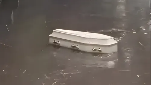 Caixão é visto flutuando durante correnteza; veja vídeo