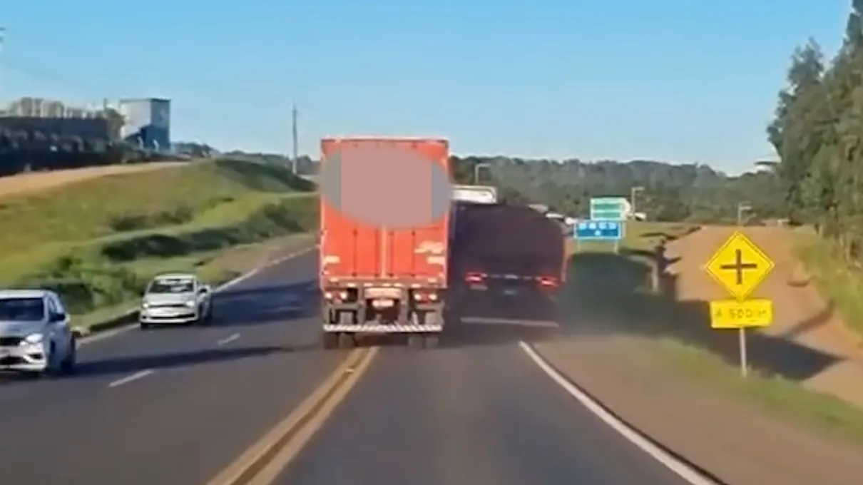 Um vídeo registrado por um internauta mostra os veículos trafegando lado a lado em um trecho de reta, já no início do perímetro urbano da cidade. Em determinado momento, um dos motoristas força a ultrapassagem e chega a invadir a pista contrária. Para evitar a colisão, o outro caminhão precisou sair para o acostamento e frear bruscamente. Assista: