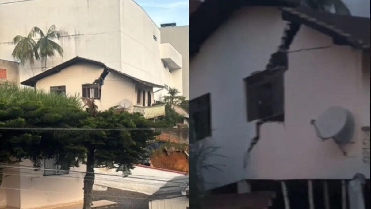 Uma casa rachou ao meio e teve parte de sua estrutura colapsada entre a tarde de segunda-feira (20) e a madrugada desta terça-feira (21), em Blumenau, no Vale do Itajaí, em Santa Catarina. Apesar do susto e de um terço do imóvel ter vindo abaixo, o incidente não deixou feridos. De acordo com a Defesa Civil do município, o desabamento foi provocado por um erro na execução da obra de um prédio localizado em frente à residência afetada.