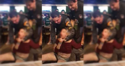 O policial deu voz de prisão e pulou a barreira de segurança do bar para prender a cliente, que já estava sendo imobilizada por um segurança do estabelecimento. Um segundo policial também salta a barreira e vai em direção da mulher.