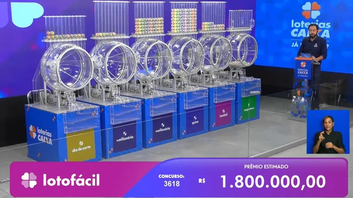 A Caixa Econômica Federal sorteou neste sábado (21) o concurso 3618 da Lotofácil com prêmio estimado em R$ 1,8 milhão. O sorteio aconteceu às 21h (horário de Brasília) ao vivo nas redes sociais da Loterias Caixa e no canal da Caixa Econômica Federal no YouTube.