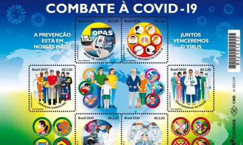 “A arte do bloco, de Alan Magalhães, apresenta o mapa-múndi aplicado em fundo azul e verde, cores que remetem calma e esperança. Elementos figurativos na forma do vírus, frases motivacionais e outros pictogramas, complementando recomendações e prevenções, compõem a vinheta”, informou os Correios por meio de nota.