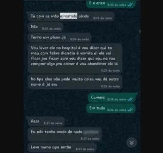 A Polícia Civil obteve imagens chocantes da criança amarrada à cama e mensagens em que a mulher ameaça abandonar o filho em uma Unidade de Pronto Socorro. “Vou levar ele no hospital e dizer que está mal, com diarreia e vômito. Aí ele vai ficar para fazer soro, vou dizer que vou na rua comprar algo para comer e vou abandonar ele lá”, escreveu a mãe.